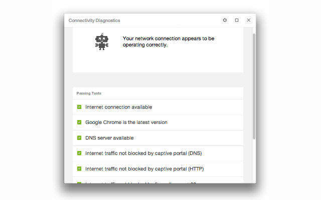 Chrome Connectivity Diagnosticsهو تطبيق لمتصفح غوغل كروم ، يمكنك من خلاله تشخيص و تحديد مكامن الخلل في انقطاع الاتصال بشبكة الأنترنت ، بدون الحاجة إلى برامج في بعض الأحيان تكون تافهة و غير مفيدة بتاتا .إذن الأمر سهل جدا كل ما عليك تنصيب الإضافة من متجر غوغل ، ستظهر الإضافة على مشغل تطبيقات غوغل كروم "App Launcher" تقوم بعد ذلك بالضغط عليه ليبدأ الفحص الذي يشمل تقريبا كل الأخطاء الشائعة .